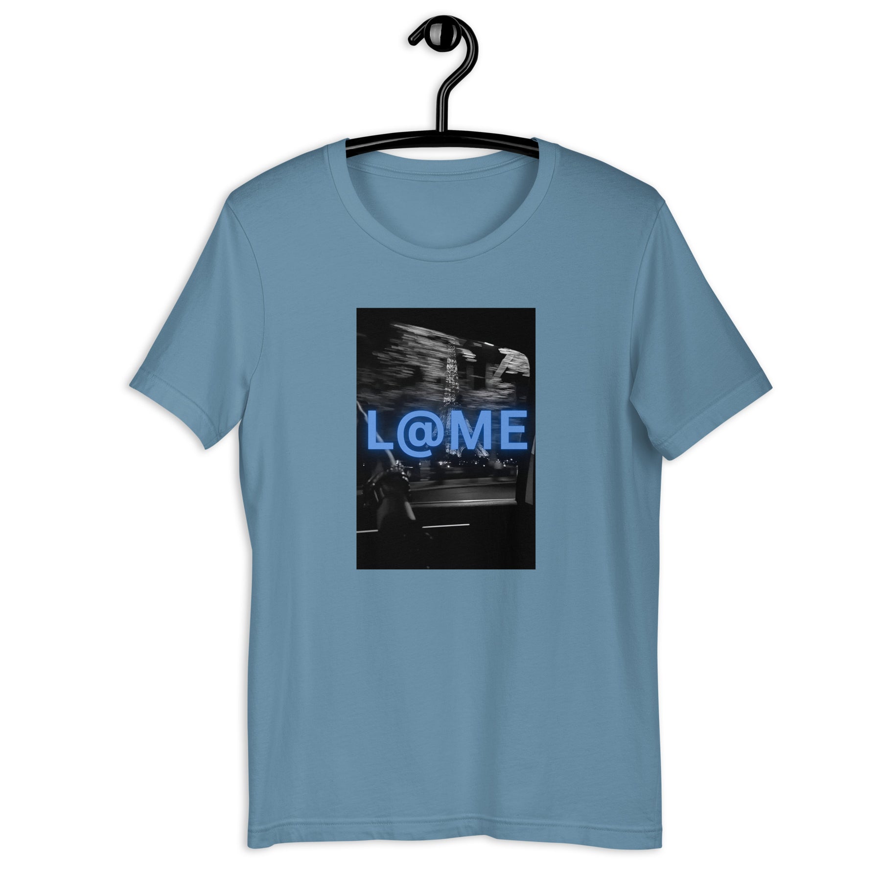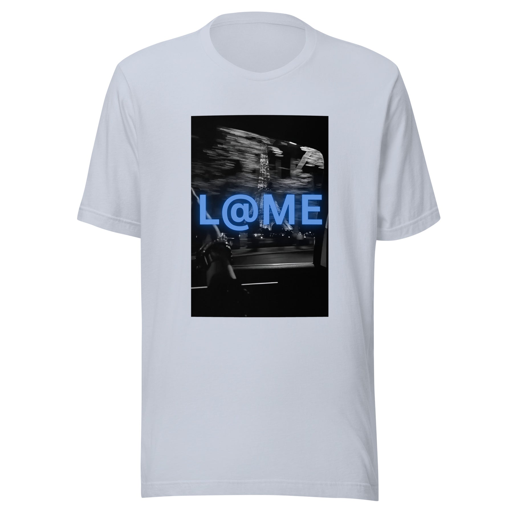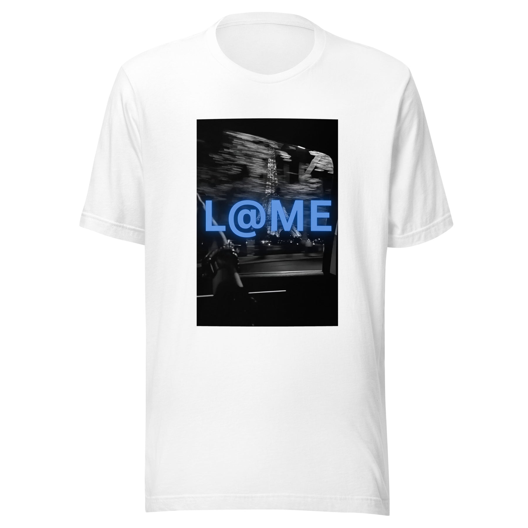 Imagine stepping into the vibrant nightlife, wearing a shirt that embodies energy and individuality. The L@ME Blue Neon Motion Graphic T-Shirt is designed for those who embrace a fast-paced lifestyle, featuring a striking electric blue logo against a blurred city backdrop.