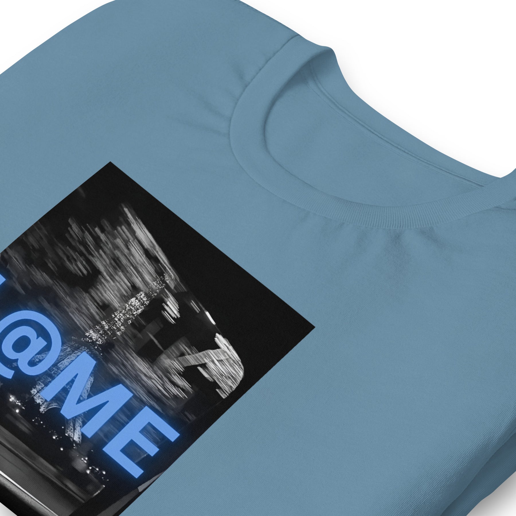 Blue neon graphic t-shirt with an electric logo and city-inspired blurred background.