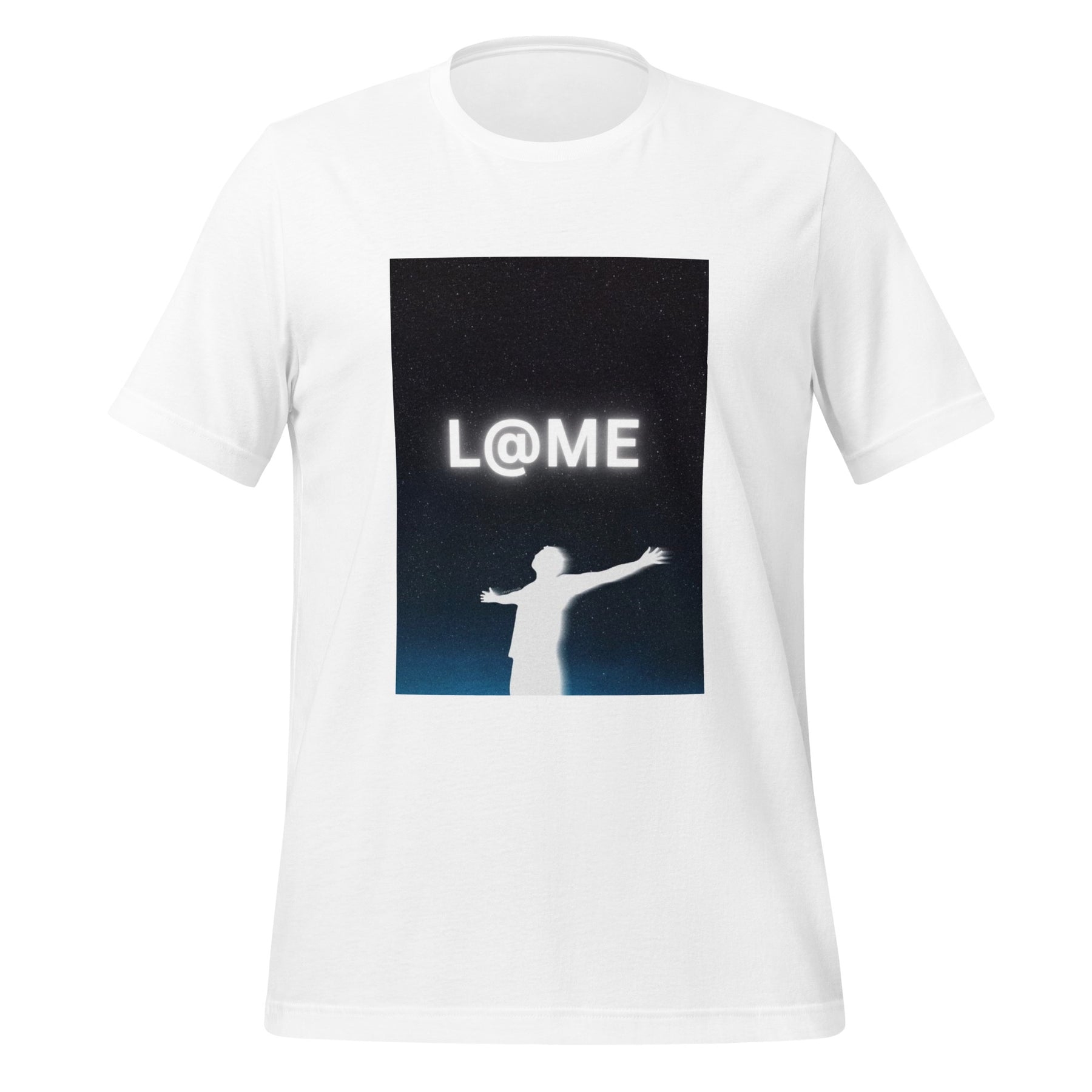 Unisex T-shirt with a white glowing silhouette under a starry night sky and L@ME logo.
