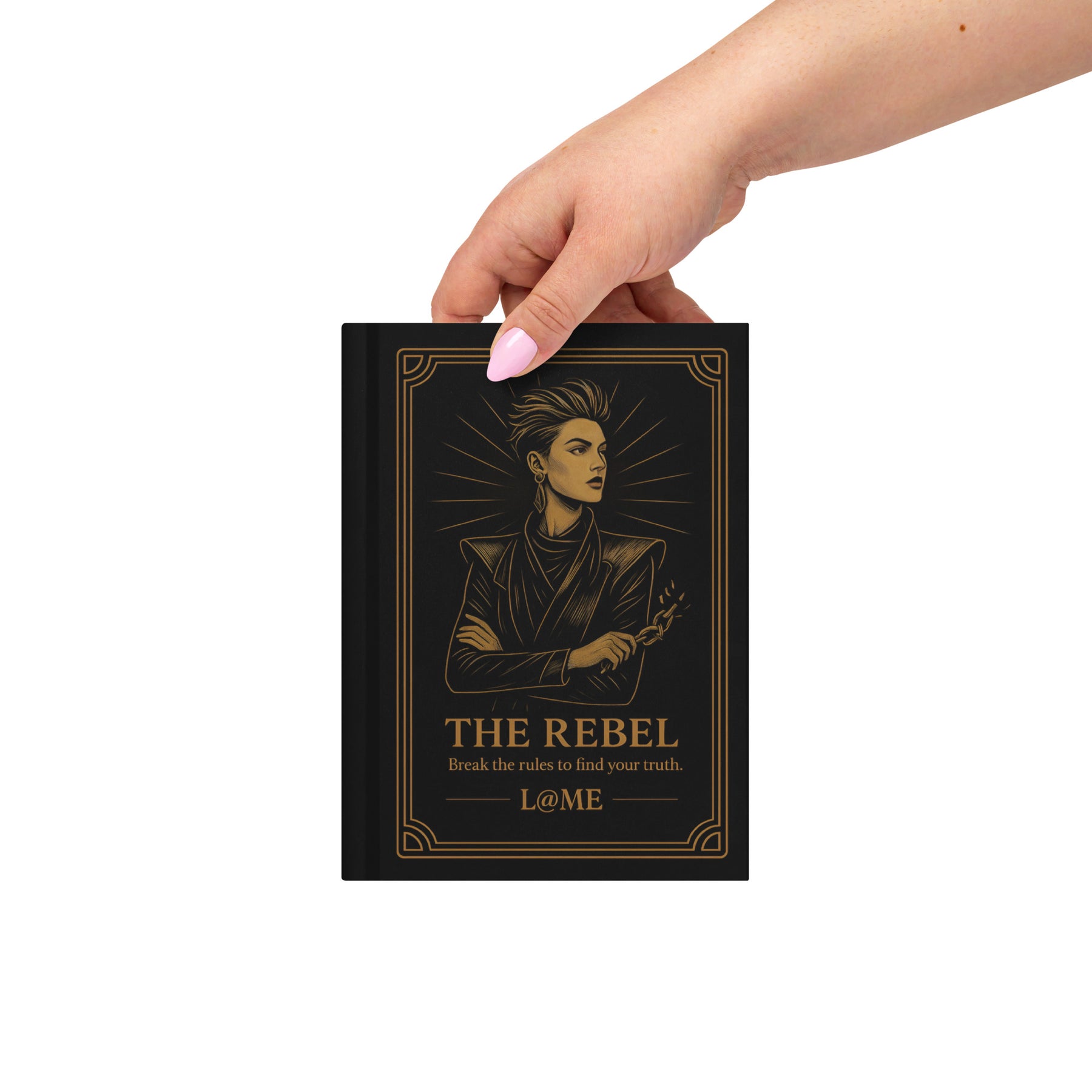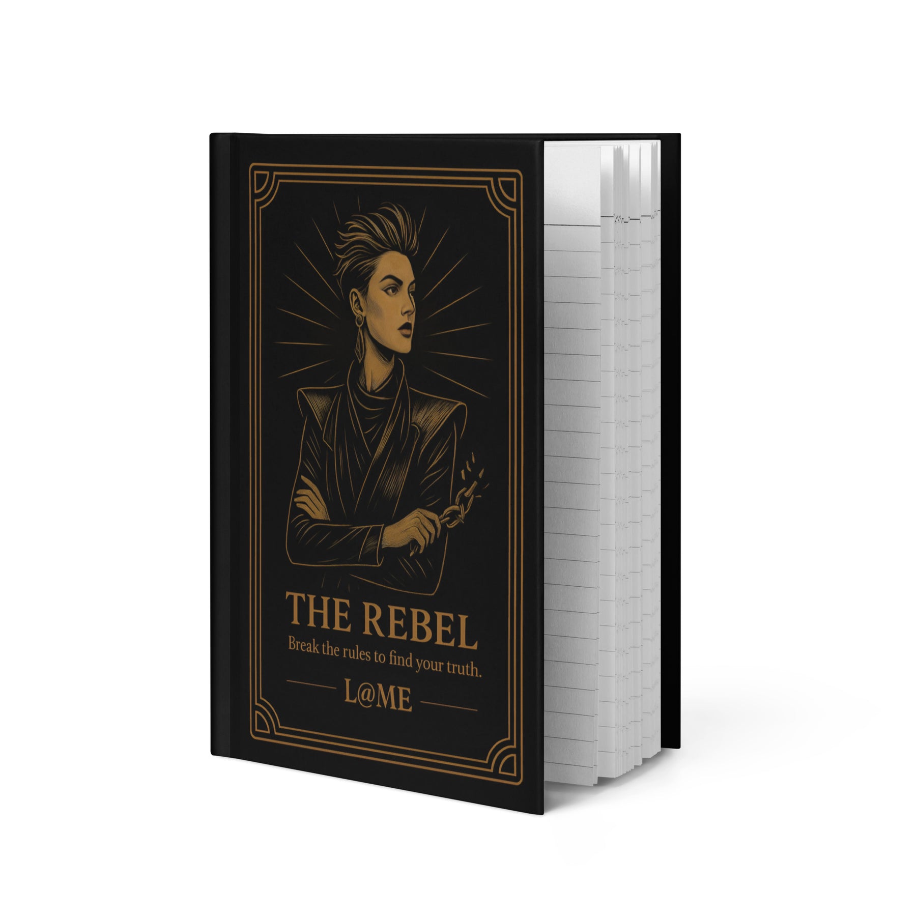 Matte black hardcover journal with gold "Rebel" tarot artwork and lined pages.
